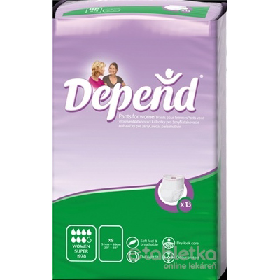 DEPEND Pants Super XS pre ženy – naťahovacie nohavičky, obv.bokov 51-85cm, savosť 1340ml, 1×13 ksDEPEND Pants Super XS pre ženy – naťahovacie nohavičky, obv.bokov 51-85cm, savosť 1340ml, 1×13 ksnaťahovacie nohavičky, obv.bokov 51-85cm, savosť 1340ml, 1x13 ks