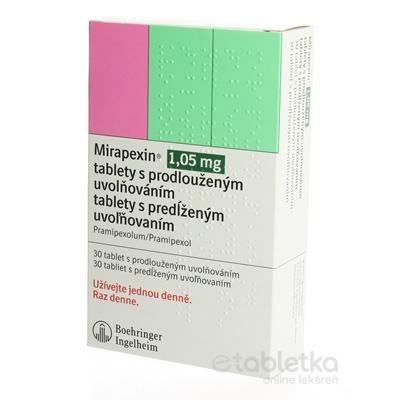 Mirapexin 1,05 mg tablety s predĺženým uvoľňovaním – tbl plg 1,05 mg 1×30 ksMirapexin 1,05 mg tablety s predĺženým uvoľňovaním – tbl plg 1,05 mg 1×30 kstbl plg 1,05 mg 1x30 ks